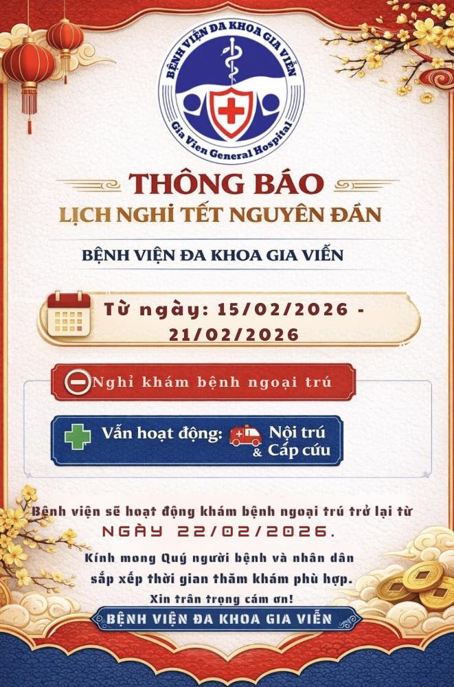 Bệnh viện Đa khoa Gia Viễn trân trọng thông báo: lịch nghỉ Tết Nguyên Đán
