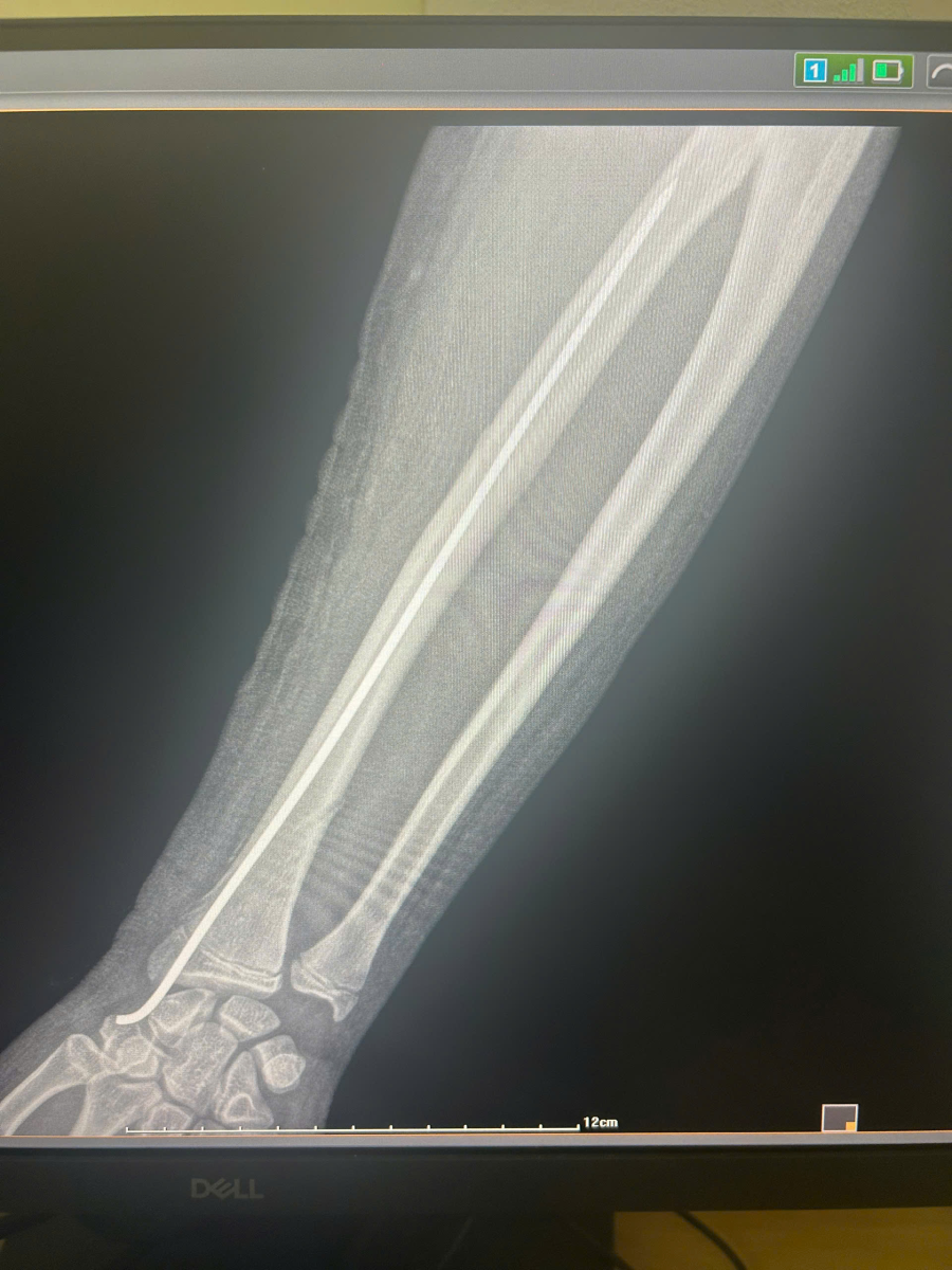 Ca phẫu thuật diễn ra thành công tốt đẹp. Hình ảnh X-quang kiểm tra sau mổ cho thấy trục xương quay đã được phục hồi hoàn toàn, đinh Kirschner nằm đúng vị trí nội tủy, cố định vững chắc ổ gãy.
