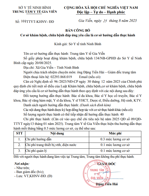 TB Cơ sở khám bệnh, chữa bệnh đáp ứng yêu cầu là cơ sở hướng dẫn thực hành Ngày đăng: 05/09/2025 - 08:01 Danh sách file: Kế hoạch hướng dẫn thực hành danh sách người giảng dạy thực hành tại TTYT Gia Viễn Chia sẻ: | In bài viết Lượt xem: 6